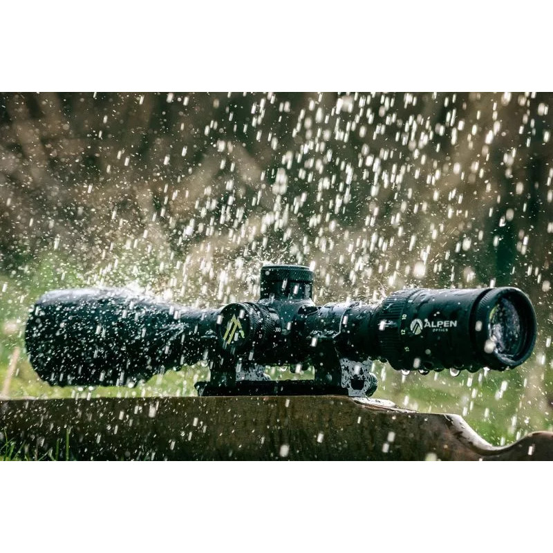 Selbst bei ungünstigen Wetterbedingungen behältst du durch die hochwertige ALPEN Optik dein Ziel fest im Blick. Starkregen, Schnee, Nebel oder sogar ein kurzes Untertauchen im Bach machen dem bis zu 3 m wasserfesten Zielfernrohr (IPX7) gar nichts aus. Das stabile Gehäuse hält dicht und Flüssigkeiten zuverlässig vom Inneren fern. Für deinen perfekten Durchblick auch bei extrem schwankenden Temperaturen wurde die Optik zudem mit Stickstoff gefüllt. So können die Linsen von innen nicht beschlagen. Als echtes Premium-Zielfernrohr ist das ALPEN OPTICS Apex XP 2.5–16x42 selbstverständlich bis 1000g Magnum Kaliber schussfest.