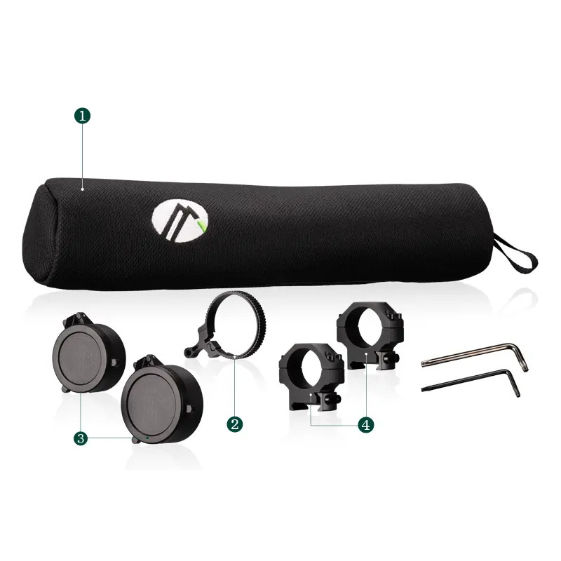 Mit unseren Apex XP Zieloptik erhältst du nicht nur überragende Performance, sondern auch ein Zubehörpaket mit (1) Schutzhülle, (2) Schnellverstellhebel, (3) Schutzkappen und (4) Montagen.